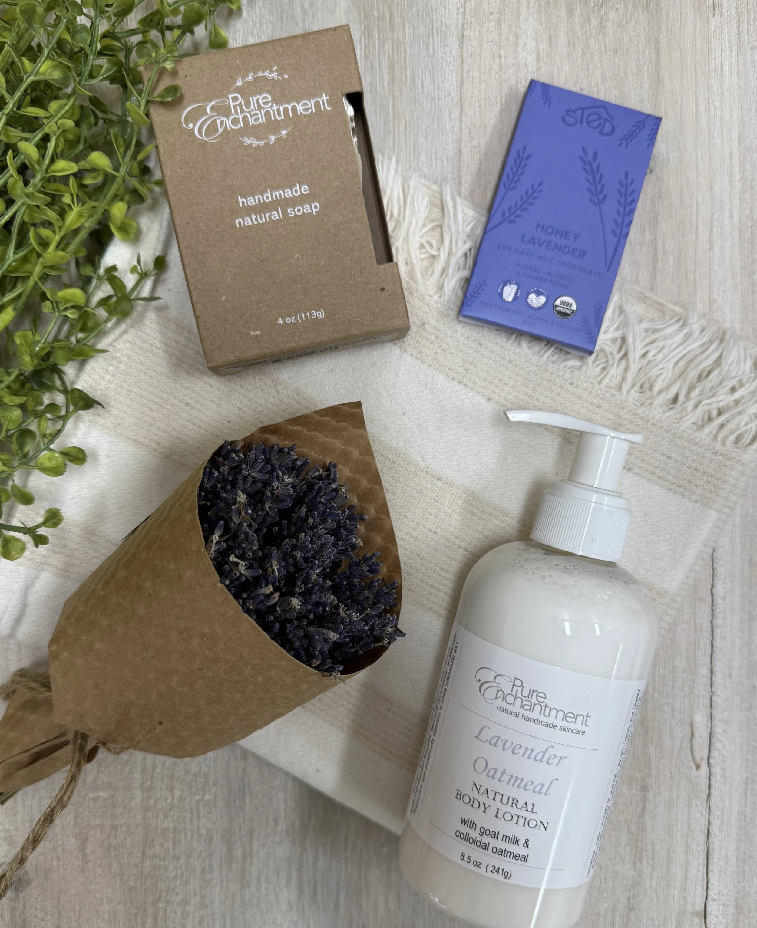 This Lavender gift set is perfect when you want to give a thoughtful gift of relaxation and self-care. It includes our nourishing Lavender Oatmeal natural pump lotion and gentle castile soap, a soft 100% Turkish cotton hand towel, a fragrant dried lavender bouquet, and a delicious honey lavender chocolate bar for a sweet, aromatic treat. This lovely set comes packaged in a reusable zippered tote for convenient storage and easy carrying.